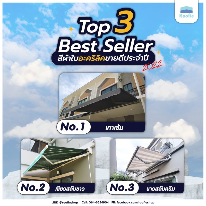 วันนี้ Roofie มาจัดอันดับสีผ้าใบอะคริลิคที่ขายดีประจำปี 2022 ให้ลูกค้าดูกัน แต่ก่อนที่ไปดูสีขายดี ขอแนะนำชนิดผ้าใบที่ใช้สำหรับกันสาดพับเก็บได้ของร้านเราก่อนนะคะ.